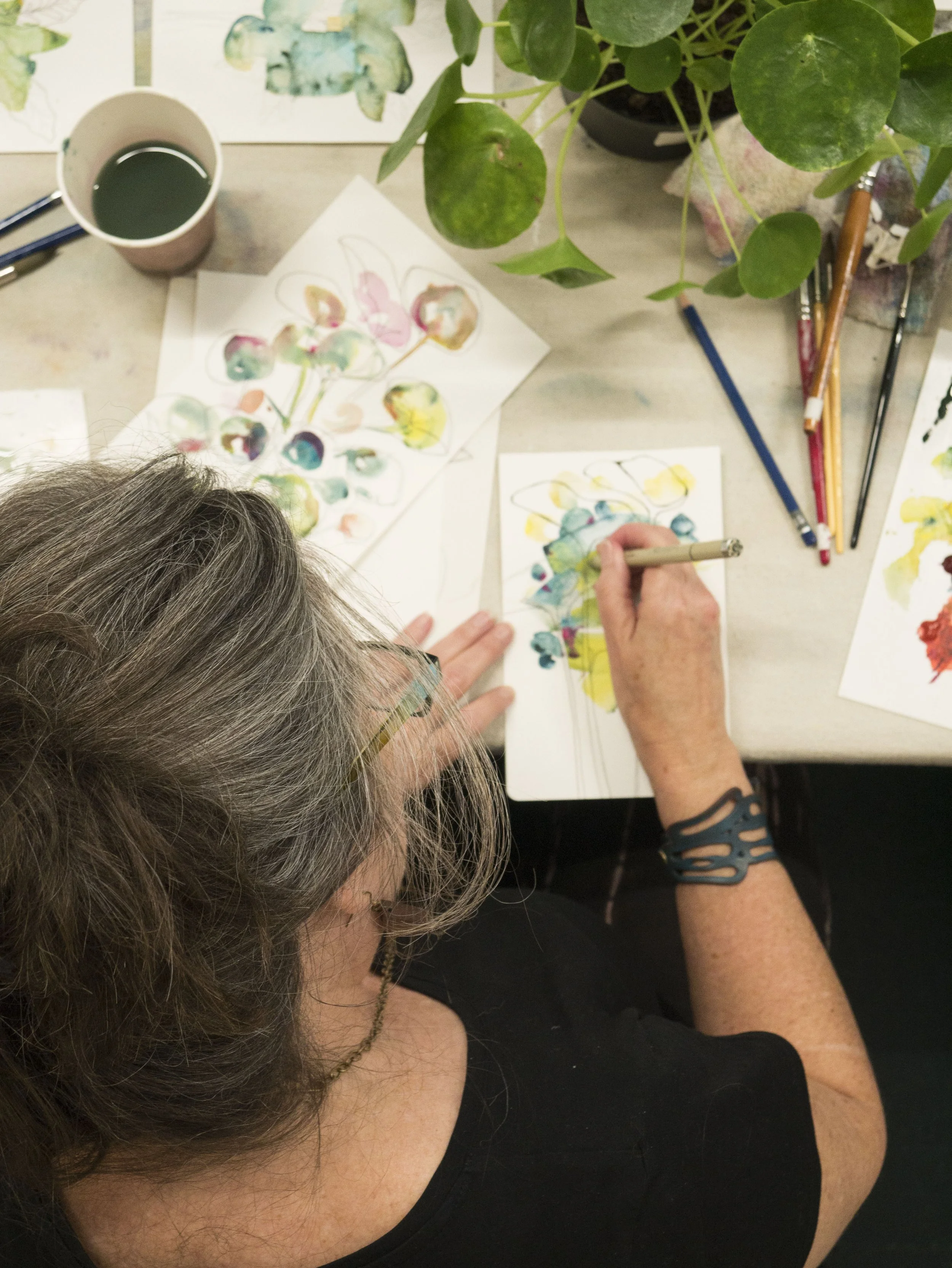 Watercolor workshops invite participants to be present in the venue, engage with the shop/collection, find joy and connection, and become comfortable with the illusive medium of watercolor through guided exercises and a project prompt.